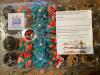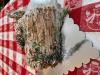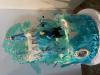 2 layers white cake with Strawberry filling, Buttercream and Fondant covering, edible paint as added design |